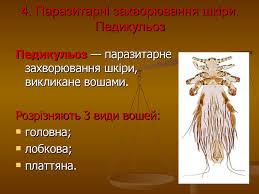 ◦ Короста: спричиняється коростяним кліщем. Характеризується сильним свербежем, що посилюється вночі. Легко поширюється в організованих колективах та гуртожитках.